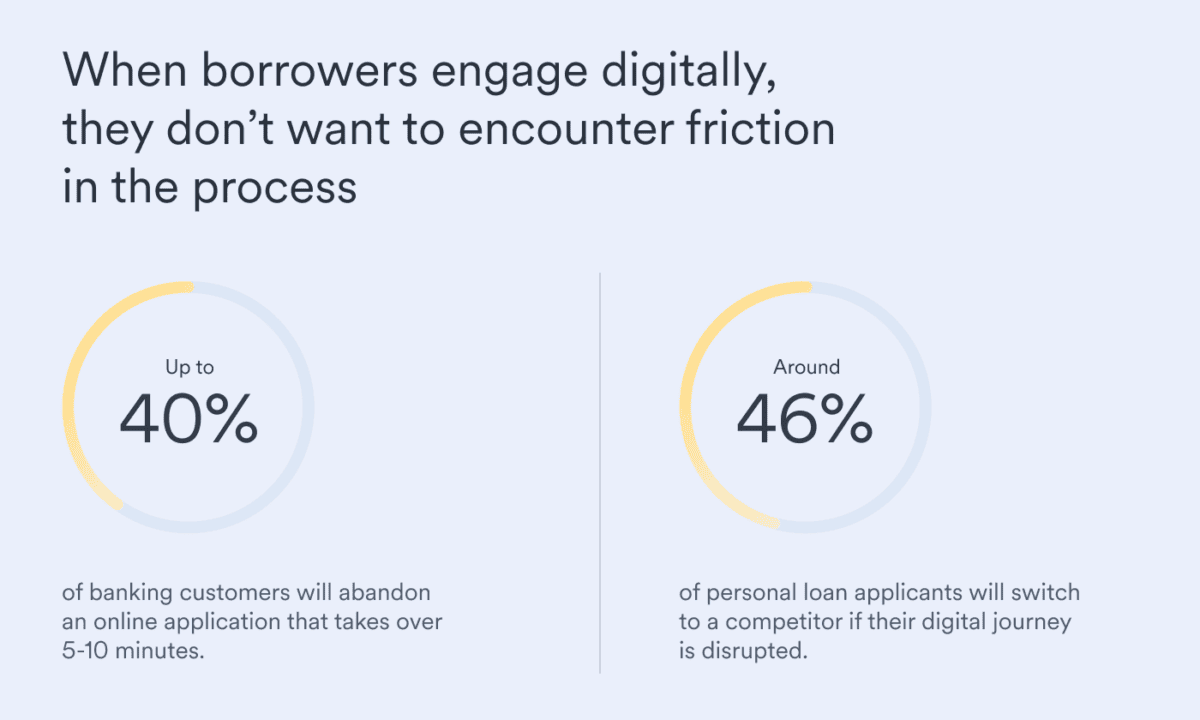 But when borrowers do engage digitally, they don’t want to encounter friction or delays partway through the process. In fact, one survey revealed that up to 40% of banking customers abandon online applications that take over five minutes (for mobile) or ten minutes (for desktop) to complete. Another found that 46% of personal loan applicants who applied online through their primary bank had their digital journey disrupted—by being required to phone a call center, visit a branch, or scan and send physical documentation—and ended up closing with a competitor instead.
