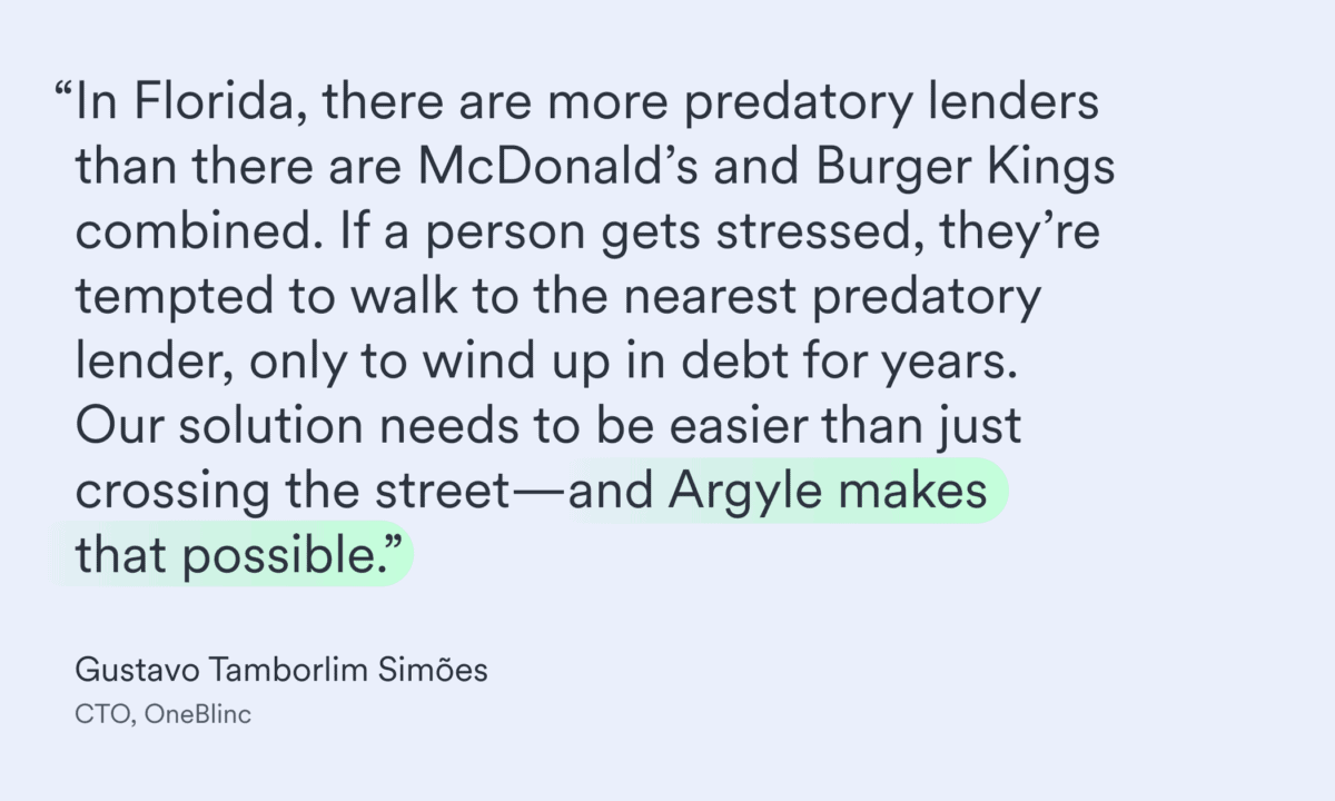 How does it work in practice? Argyle’s partners at OneBlinc used our automated Income & Employment Verification solution to simplify loan originations for low-income federal workers. By streamlining their application and underwriting processes with Argyle, OneBlinc reduced borrower application times from 20 hours to 10 minutes—and they saved lenders at least 1,000 hours of busywork each month.