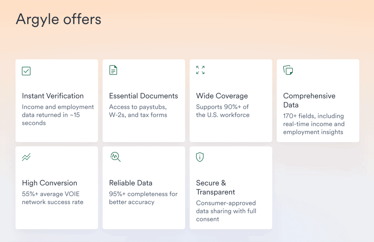 That includes freelancers and self-employed individuals, among other types of workers.If an applicant can’t locate an employer or payroll provider in our network, they can also take advantage of Argyle’s Document Upload feature to post their proof of income documents and have them automatically scanned and processed through Ocrolus’s optical character recognition (OCR) service.